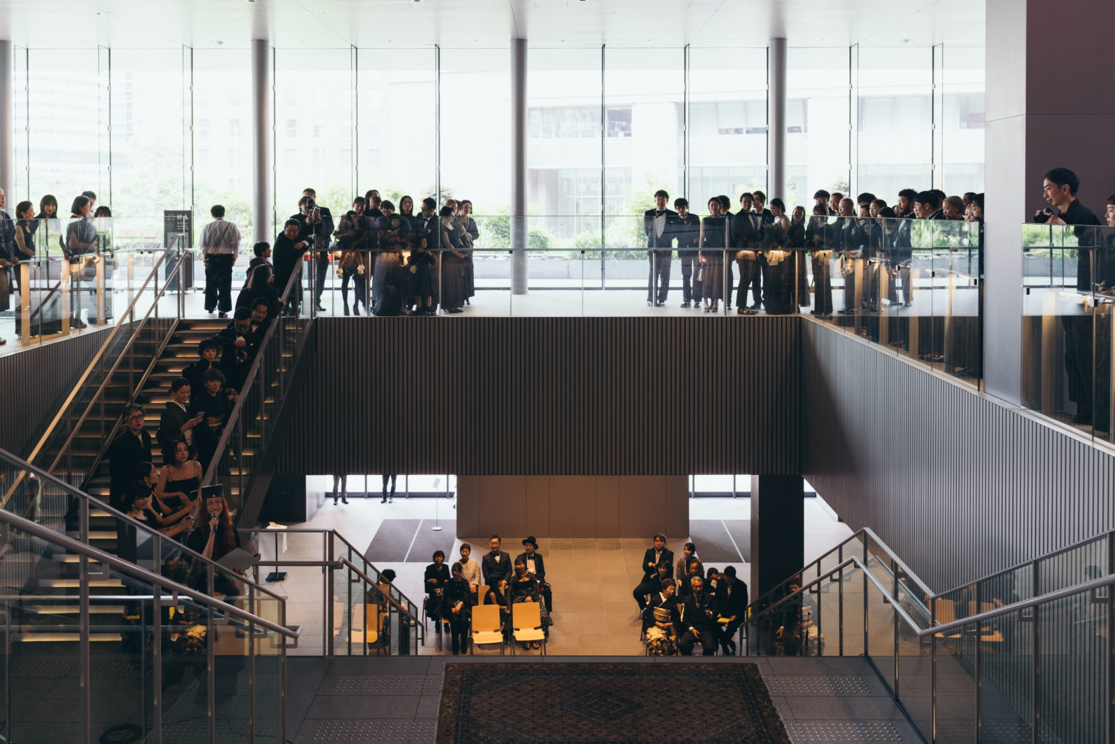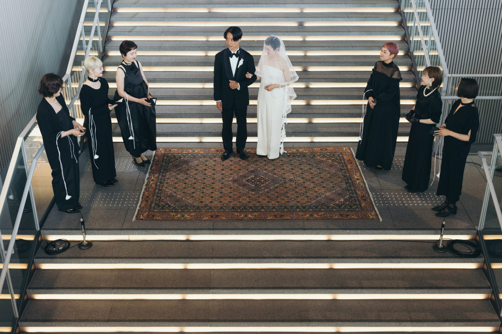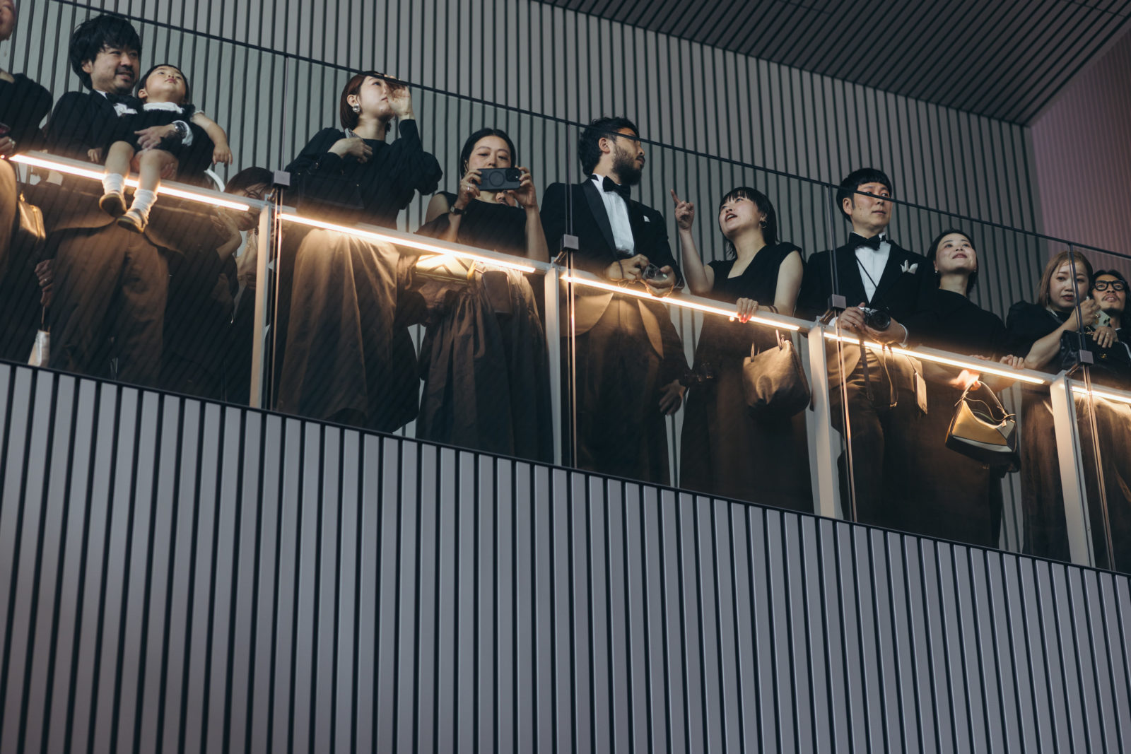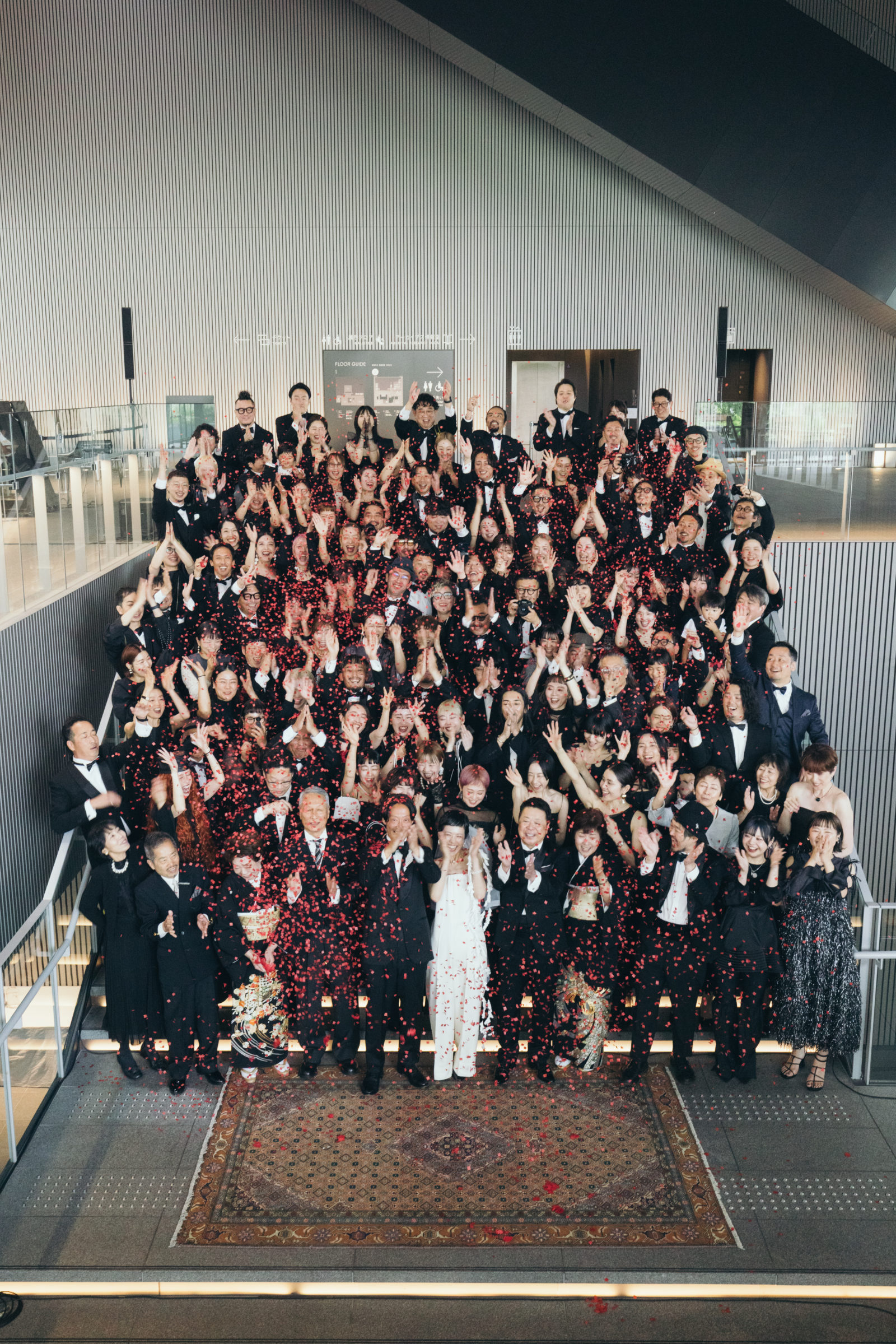 当日、会場の支度が整うとドレスコードである「ブラックフォーマル」の装いに身を包むゲストが続々と到着。まるでレッドカーペットの祭典のように全員が主役のよう。