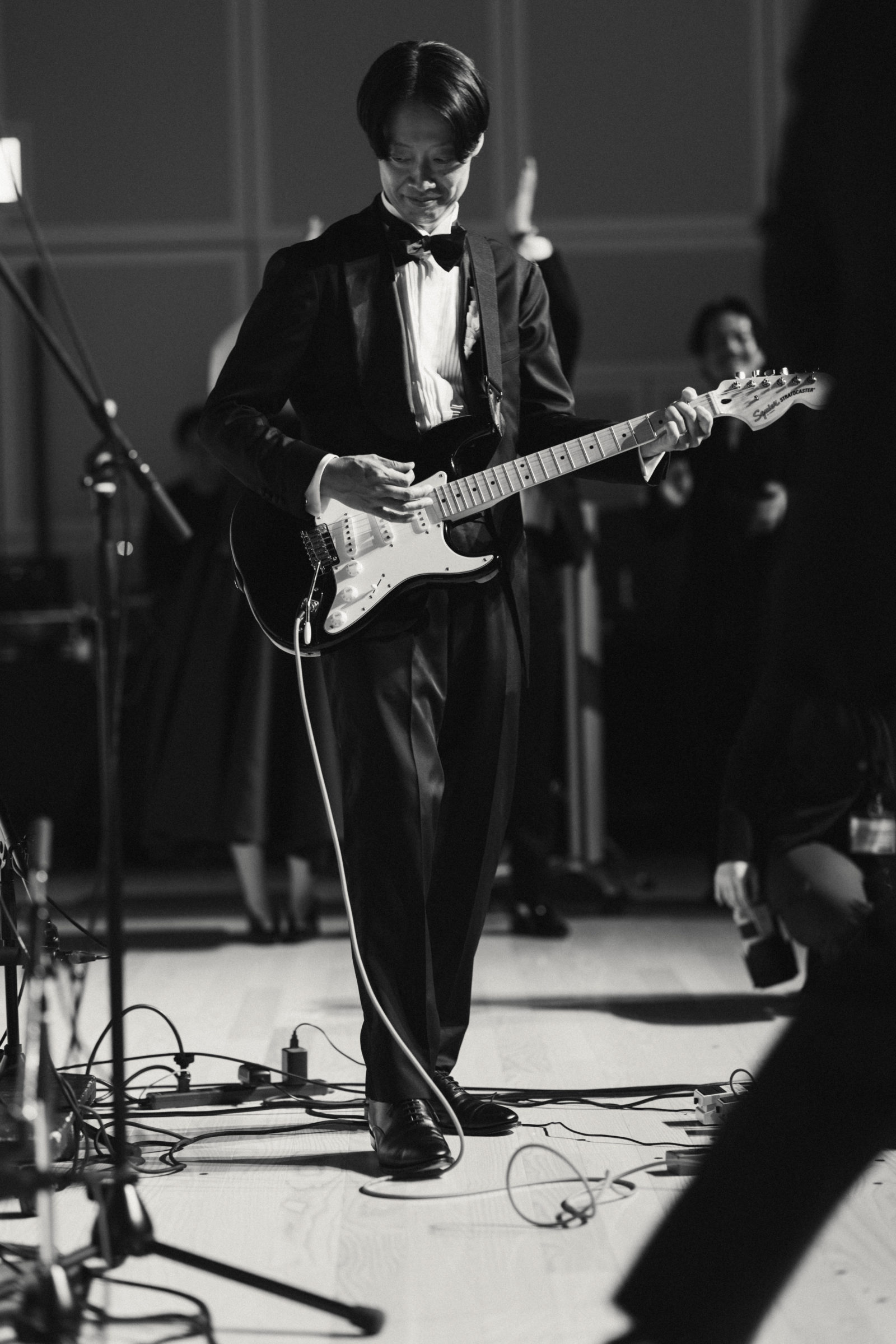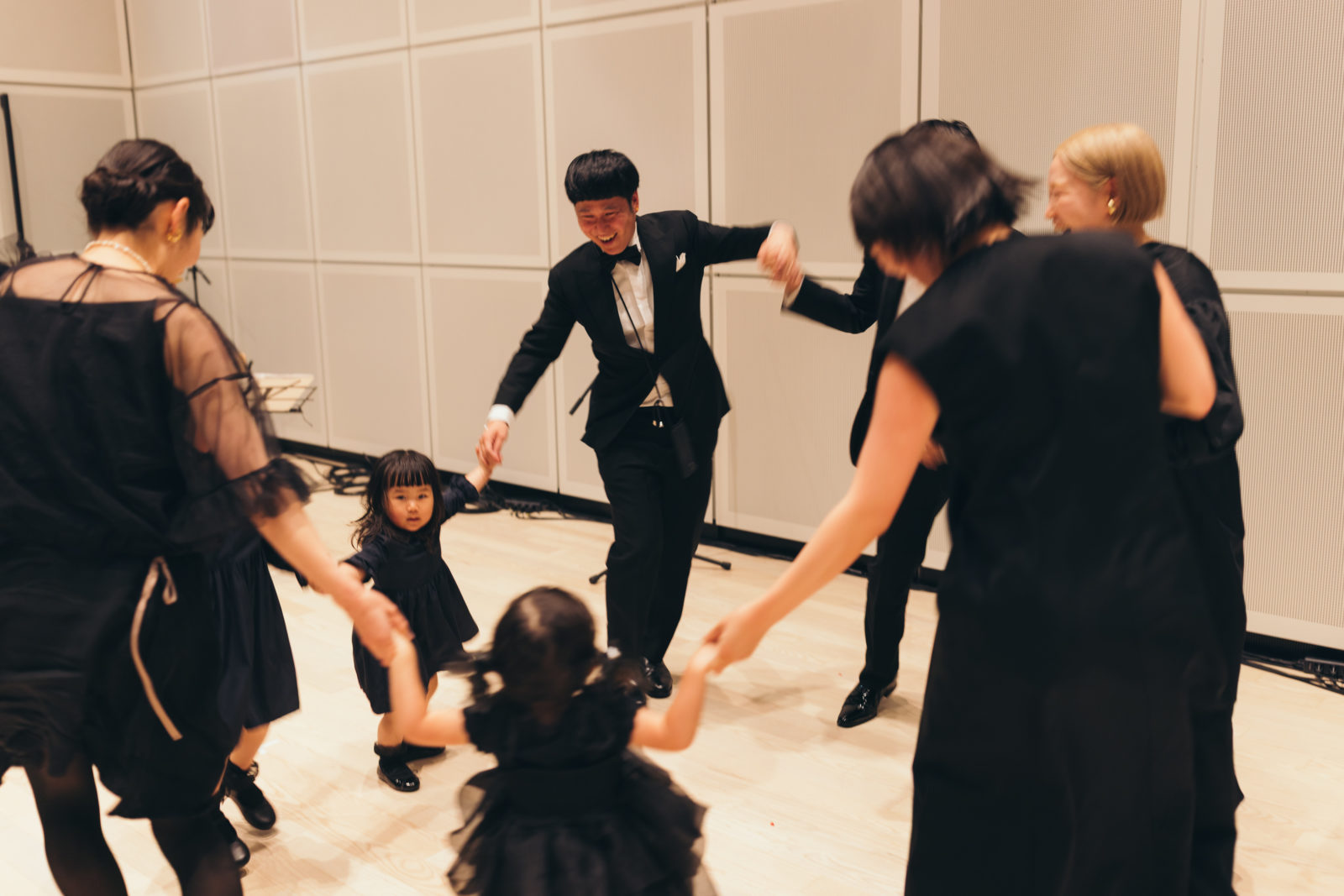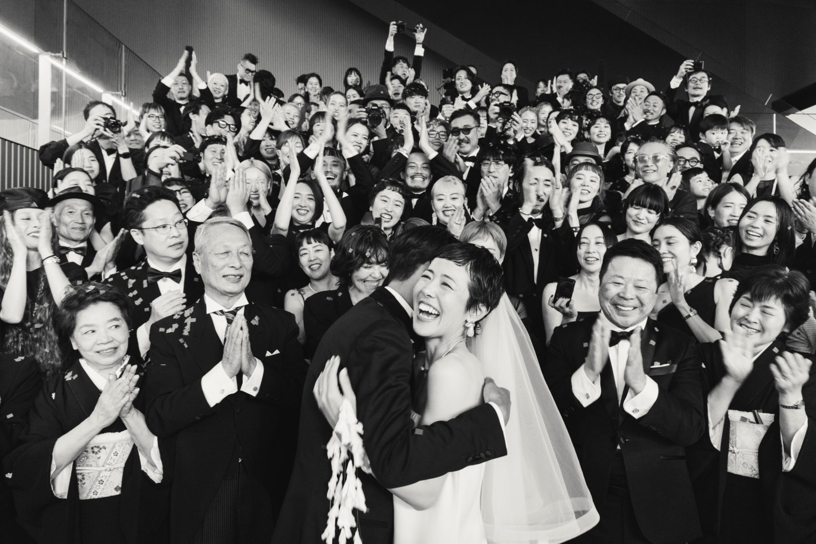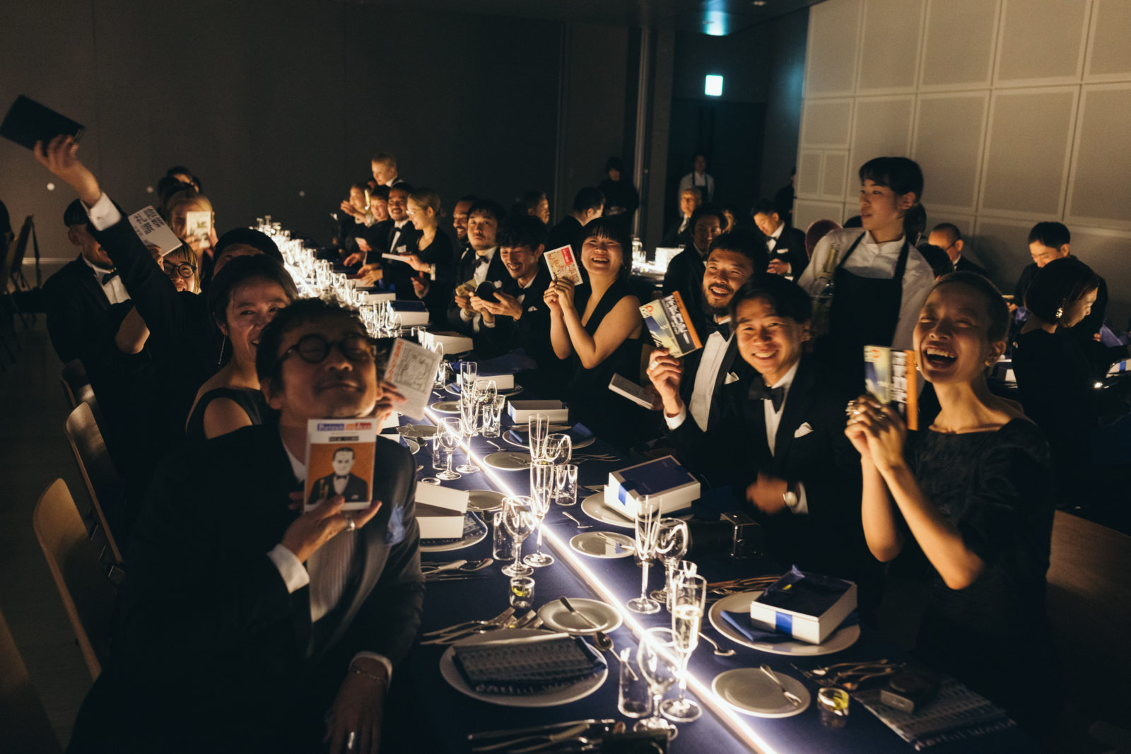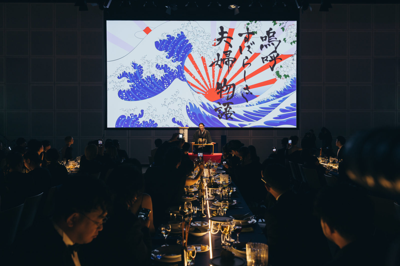 当日、会場の支度が整うとドレスコードである「ブラックフォーマル」の装いに身を包むゲストが続々と到着。まるでレッドカーペットの祭典のように全員が主役のよう。