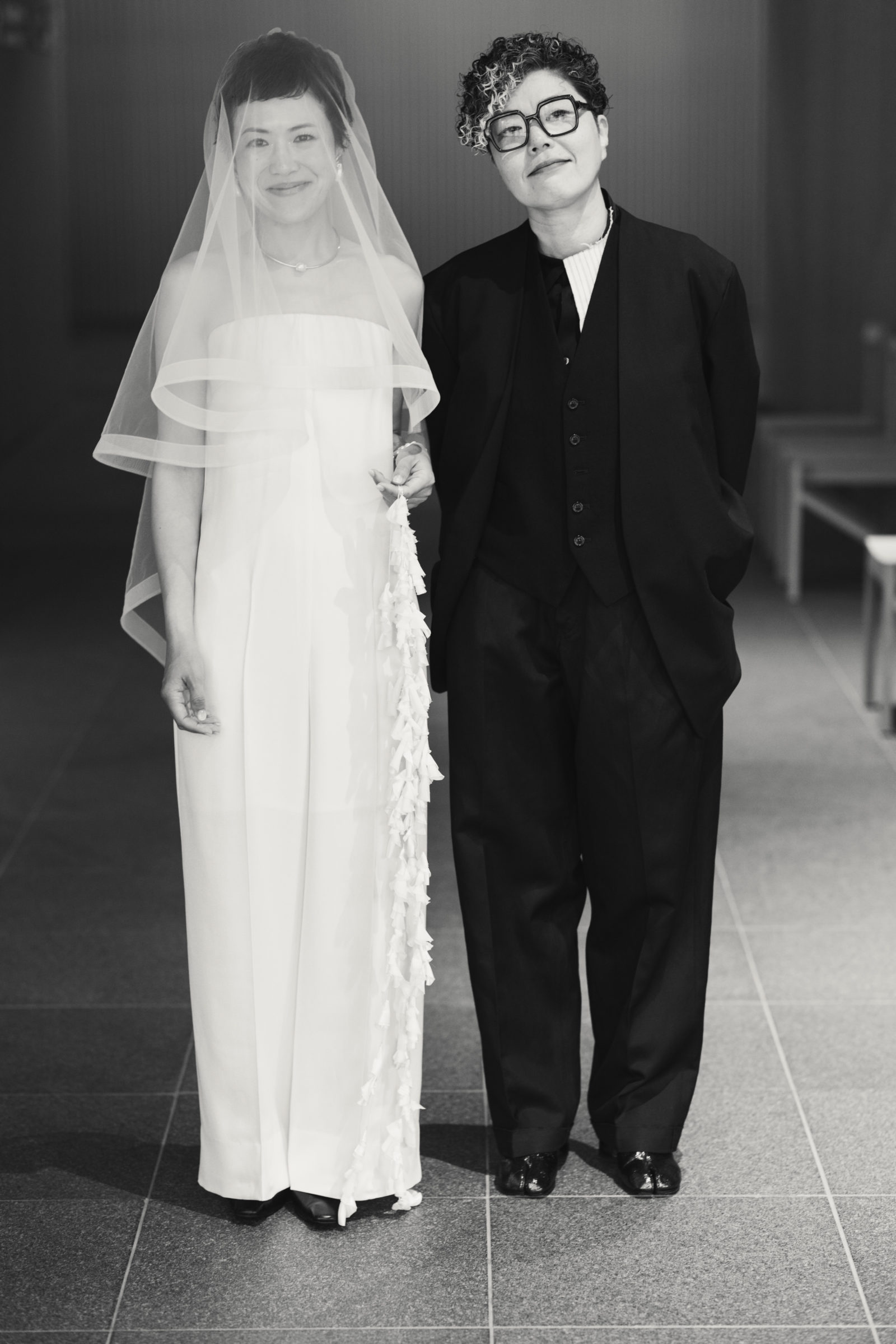 両親のエスコートで入場する私は、SaboraMiのジャンプスーツにウェディングベール。