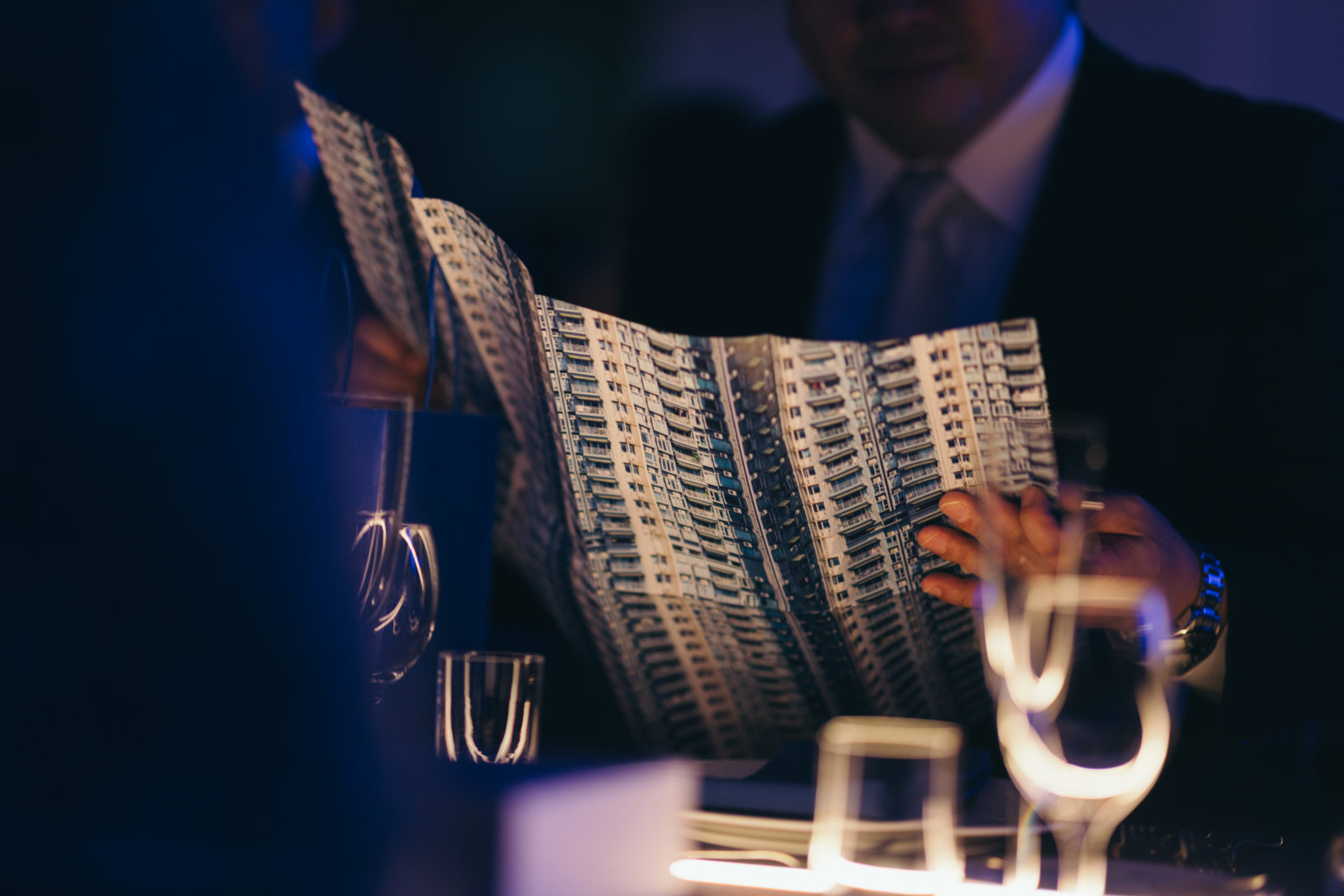 青く光るパーティー会場は、初めてここを訪れた時に頭の中で描いた景色がしっかりと形に。